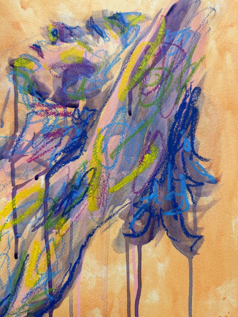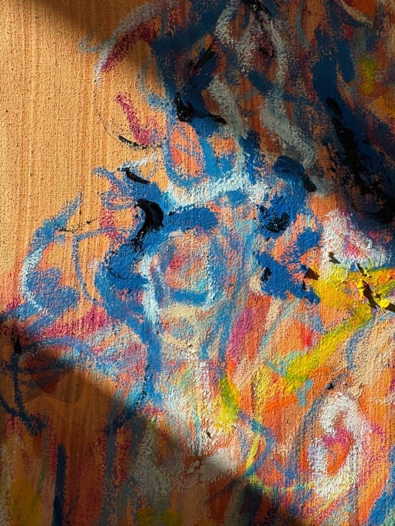 Exploring expressive, gestural marks, I found myself experimenting with attempting to create scenes rather than capturing a moment through inventing movement in a painting. Having experimented with different materials for my artwork; collaboratively handmaking coloured textured paper as well as building my own canvases. I settled on taut calico stretched over wood as this was the sturdiest for my impulsive and harsh mark marking, which was becoming increasingly gestural and expanding materialistically to oil pastels layered on acrylic with oil paint.