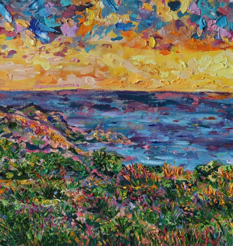 This unquenchable infatuation for the beauty of the world makes every piece of mine romantic. I narrate a version of my encounters, stories of the atmosphere and my subject’s persona onto canvas, utilising colour and mark-making in an intuitive, impasto and visceral way. Pastel stains depict my interpretation of the experience, the exaggerated colour palette permanently brands the artwork with the potency of my temporary emotions. I’ve no desire to replicate a person or scene, simply to translate what it meant to me in that moment.