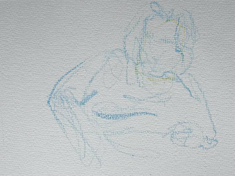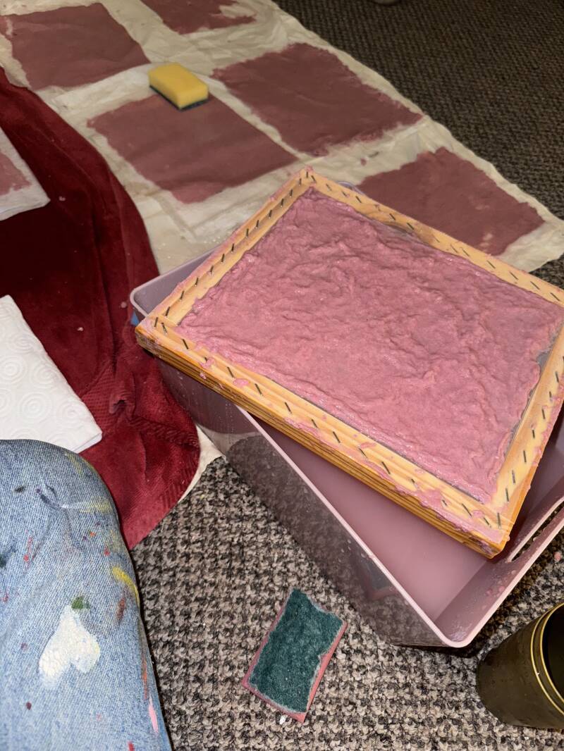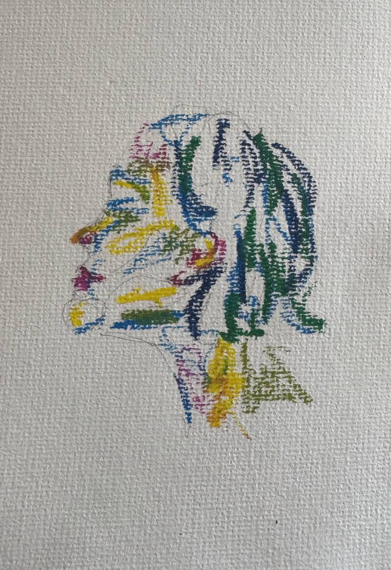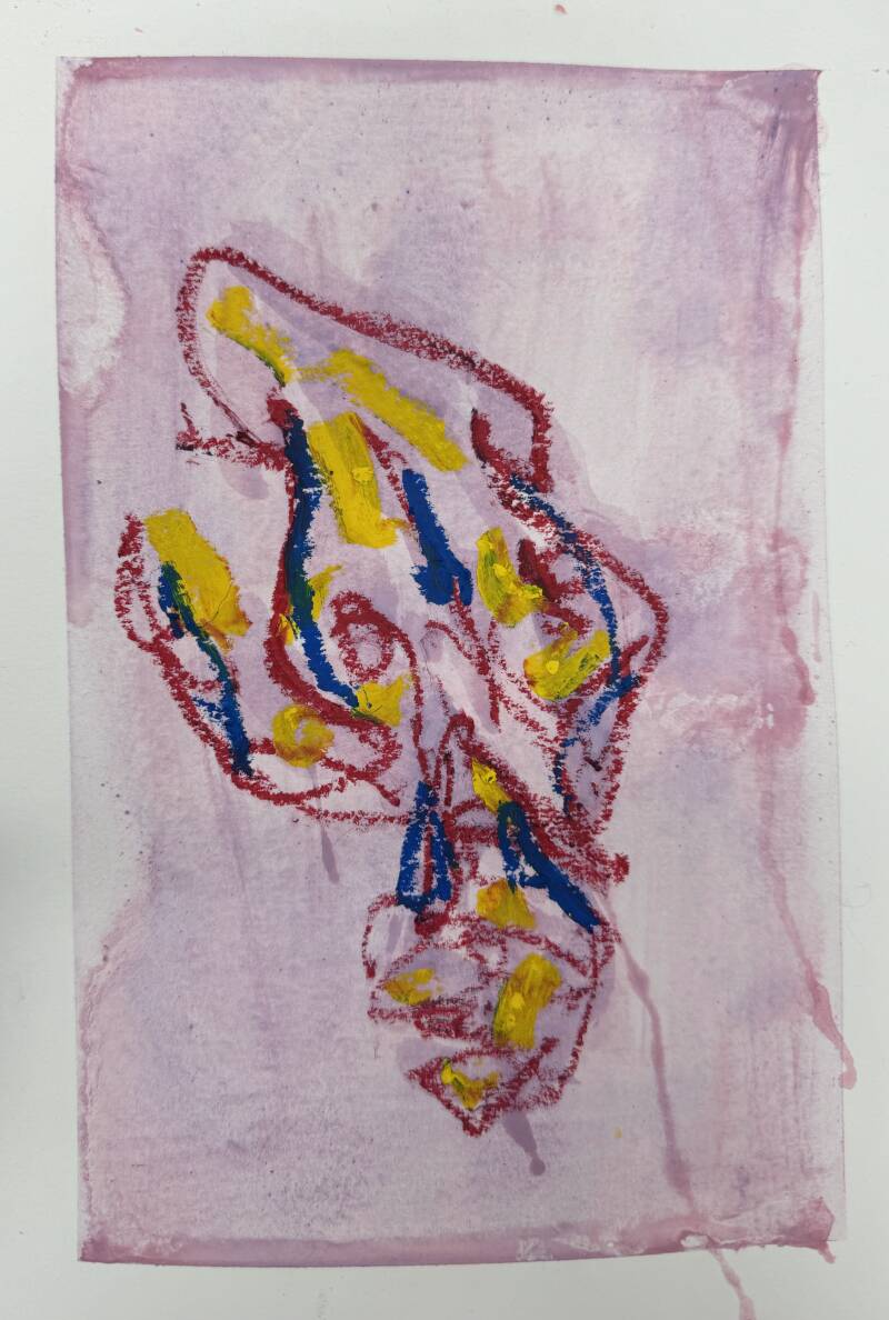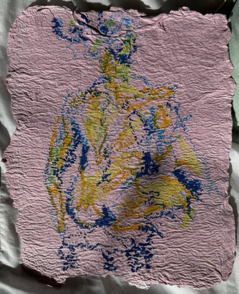 These coloured pastel and pencil sketches are part of a collaborative hand-made paper project I did with Jessica Hegarty. We collected waste paper and materials left over from our practices and studio waste bins. We combined different textural and coloured card with hot water to make a solution which we sifted, pressed and dried.